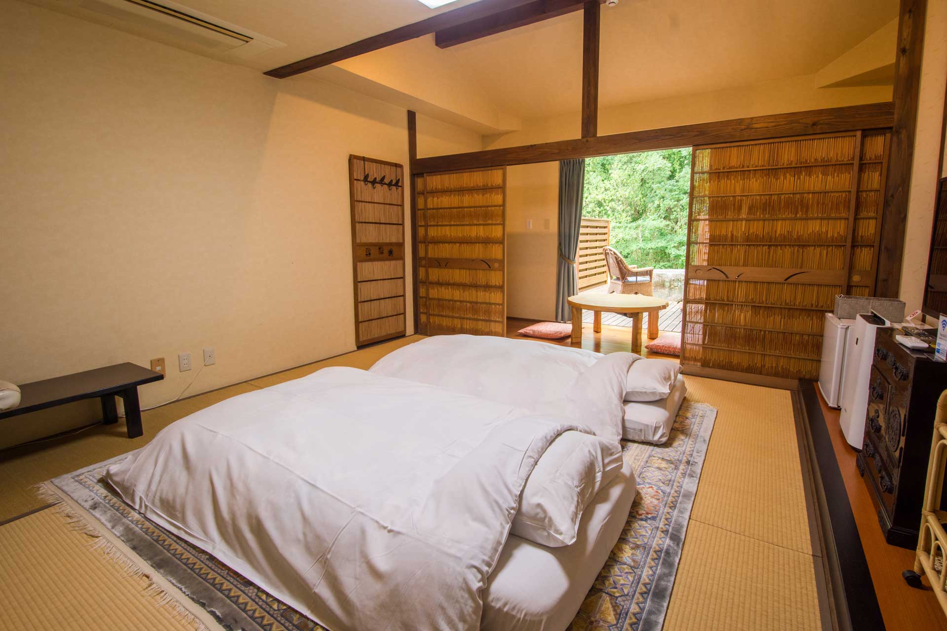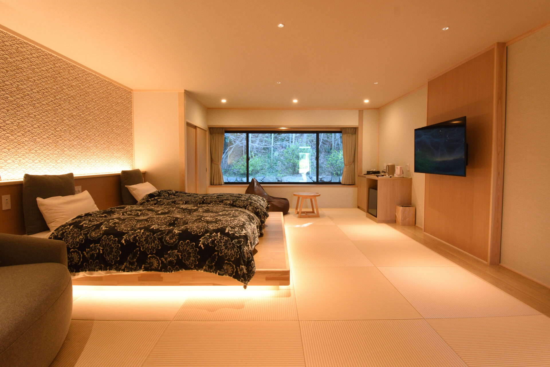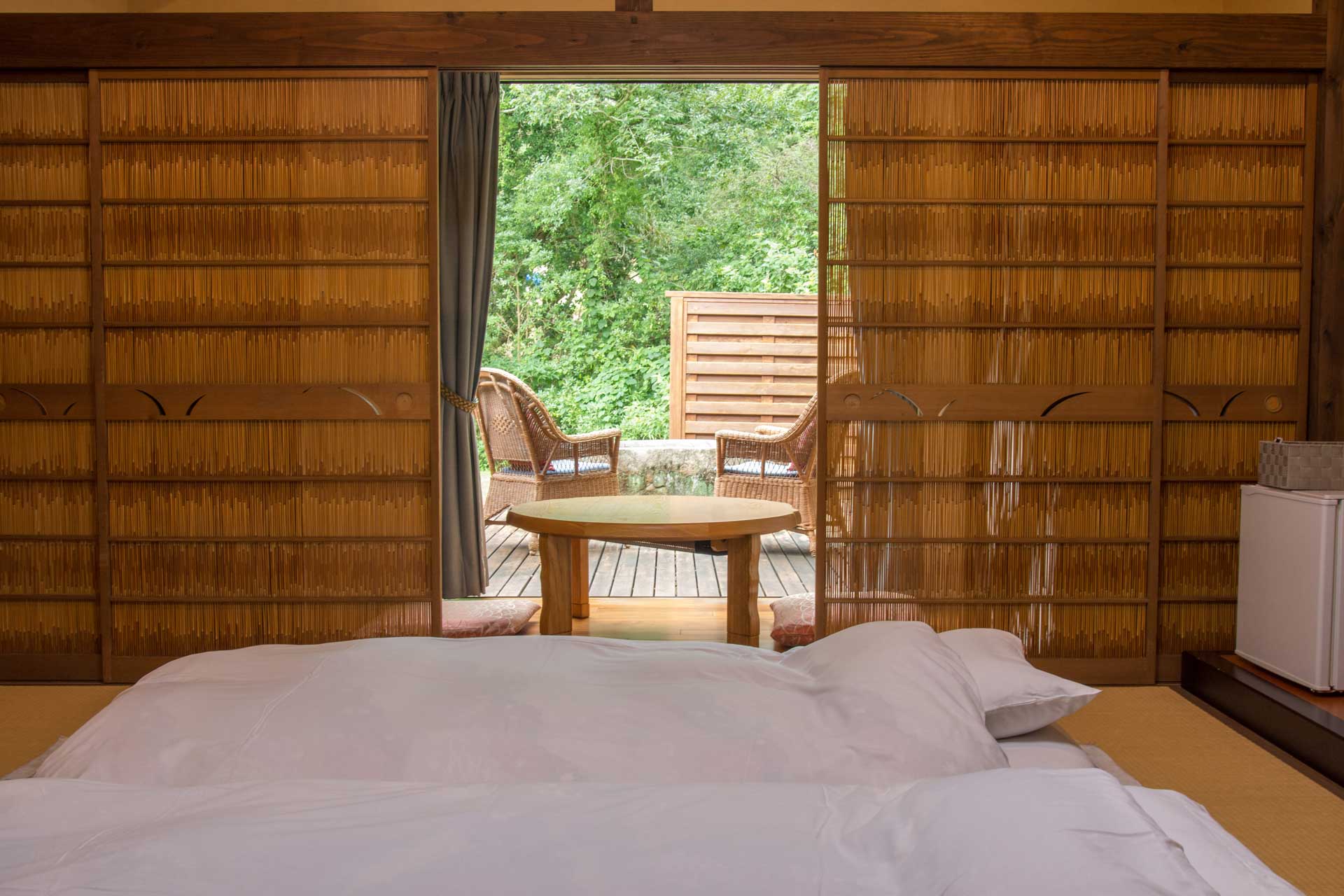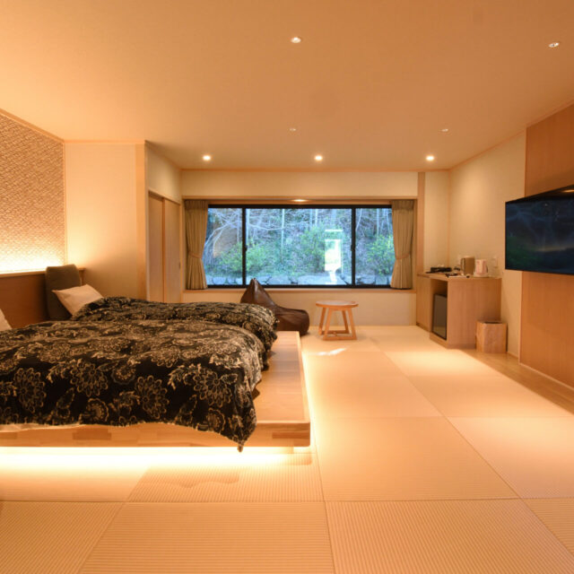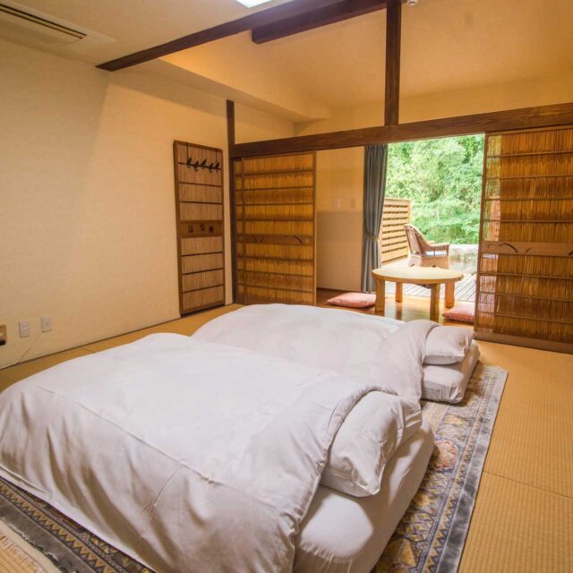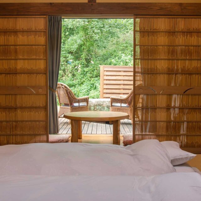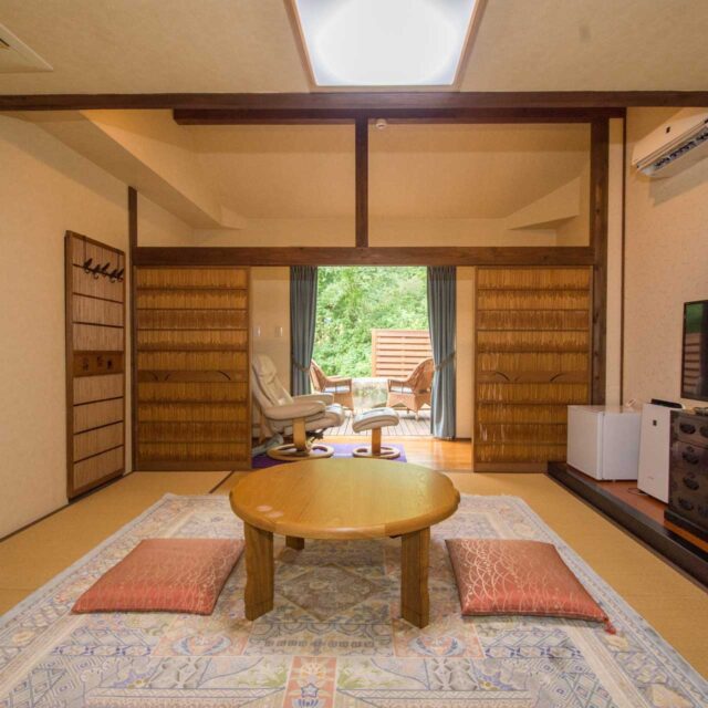 福岡と北九州の中間地点にある。3000坪庭園と全室離れタイプ13部屋の旅館。